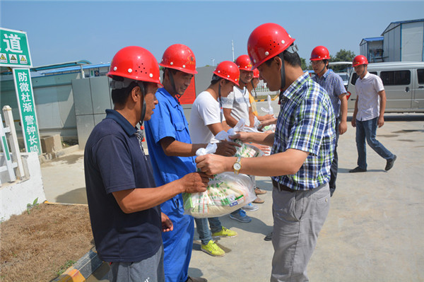 8月14日上午,開發(fā)公司副總裁劉建華帶隊來到園區(qū)派出所、夢家園、許莊變、2014年市政二標、生產(chǎn)力中心等項目工地,現(xiàn)場慰問奮戰(zhàn)在高溫一線的企業(yè)員工和建筑工人,并親自給他們遞上了毛巾、肥皂、洗發(fā)水、清涼油等防暑降溫物品。