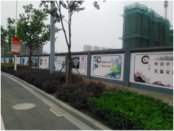 目前,現(xiàn)場各項(xiàng)安全文明設(shè)施正在緊鑼密鼓的建設(shè)中,其中臨時(shí)圍墻不僅是工地對外展示的第一形象,也是企業(yè)宣傳、安全宣傳、方案公示等信息的展示平臺。項(xiàng)目部通過人工手繪結(jié)合局部噴繪的方式既宣傳了創(chuàng)文、創(chuàng)衛(wèi)、核心價(jià)值觀的標(biāo)語,又營造了“青磚綠瓦”的江南韻味。為園區(qū)的創(chuàng)文建設(shè)增添了新的亮點(diǎn)。