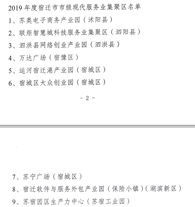 近日,根據(jù)《市發(fā)展改革委關(guān)于認(rèn)定2019年度宿遷市市級(jí)現(xiàn)代服務(wù)業(yè)聚集區(qū)的通知》,蘇宿園區(qū)生產(chǎn)力中心成功創(chuàng)成宿遷市市級(jí)現(xiàn)代服務(wù)業(yè)聚集區(qū)。