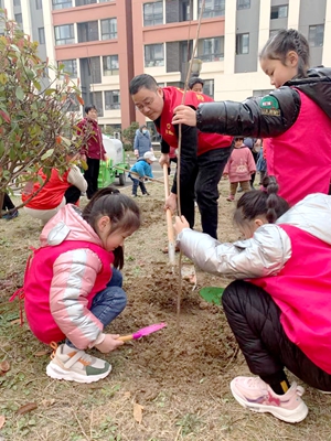 揮鍬鏟土、培土圍堰、提水澆灌……參加勞動(dòng)的志愿者與孩子們種下棵棵樹苗,播灑片片綠意,忙得不亦樂乎,植樹現(xiàn)場(chǎng)一片繁忙景象。