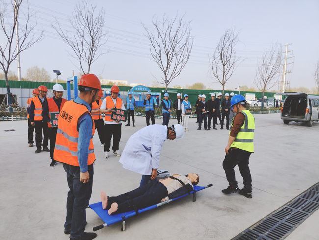 本次演練共分6個(gè)小組,分別為:現(xiàn)場(chǎng)模擬組、現(xiàn)場(chǎng)警戒(搶修)組、應(yīng)急救援(疏散)組、通訊聯(lián)絡(luò)組、事故調(diào)查組、 觀摩組。假設(shè)工人在生活區(qū)違規(guī)使用大功率電器突發(fā)火災(zāi),被煙霧和火勢(shì)圍困,二樓有人發(fā)出救援信號(hào),正在附近巡查的安全員發(fā)現(xiàn)情況后,立即趕赴現(xiàn)場(chǎng)并打電話給項(xiàng)目生產(chǎn)負(fù)責(zé)人,在接到通知后,項(xiàng)目生產(chǎn)負(fù)責(zé)人迅速安排項(xiàng)目部應(yīng)急救援辦公室負(fù)責(zé)人,并啟動(dòng)應(yīng)急預(yù)案,各救援小組立即到達(dá)現(xiàn)場(chǎng)開(kāi)展工作,安全員迅速引導(dǎo)全體人員有序從疏散樓梯疏散到安全位置,救援組帶著擔(dān)架、急救箱等趕赴現(xiàn)場(chǎng),將“受傷”人員用擔(dān)架從房?jī)?nèi)撤離到安全位置,同時(shí)救援醫(yī)生對(duì)“受傷”人員進(jìn)行簡(jiǎn)單的心肺復(fù)蘇、人工呼吸,并迅速送往醫(yī)院進(jìn)行治療。