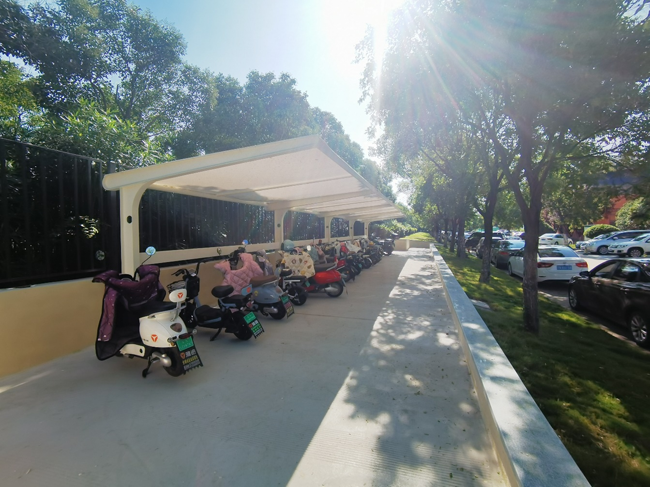本次共建設(shè)17處膜結(jié)構(gòu)車棚,總約1100m2,共可停放380余輛非機(jī)動(dòng)車,新車棚干凈明亮、設(shè)施齊全,既解決了停車需求,又消除了工業(yè)坊內(nèi)的電動(dòng)車安全隱患,得到了進(jìn)駐工友的一致好評(píng)。