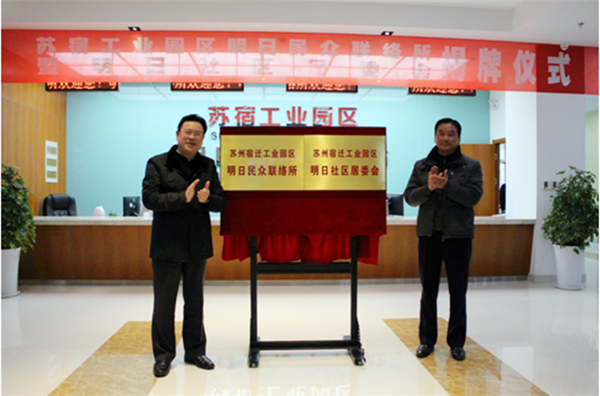 1月6日,宿遷市副市長,蘇宿園區(qū)黨工委書記、管委會主任方文浜與居民代表侍軍共同為明日民眾聯(lián)絡所和明日社區(qū)居委會揭牌,園區(qū)第二個民眾聯(lián)絡所正式建成投用,第一個社區(qū)居委會正式成立。