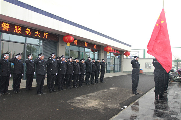 2月8日上午8時(shí)50分,根據(jù)第三次“忠誠教育周”活動安排,園區(qū)分局全體民警、輔警在分局辦公大樓前冒著大雪舉行升國旗等“忠誠教育周 ”主題活動。